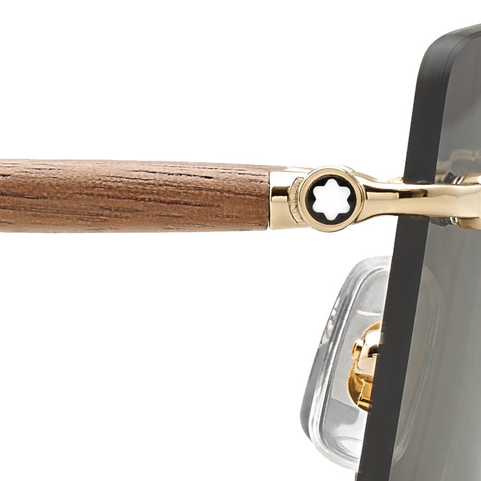 Ces lunettes de soleil non cerclées carrées possèdent une monture métallique dorée et des verres gris. Les branches tubulaires arborent l'emblème Montblanc et sont rehaussées d'un élément en bois. Le logo Montblanc est gravé au laser sur le verre gauche des lunettes de soleil.