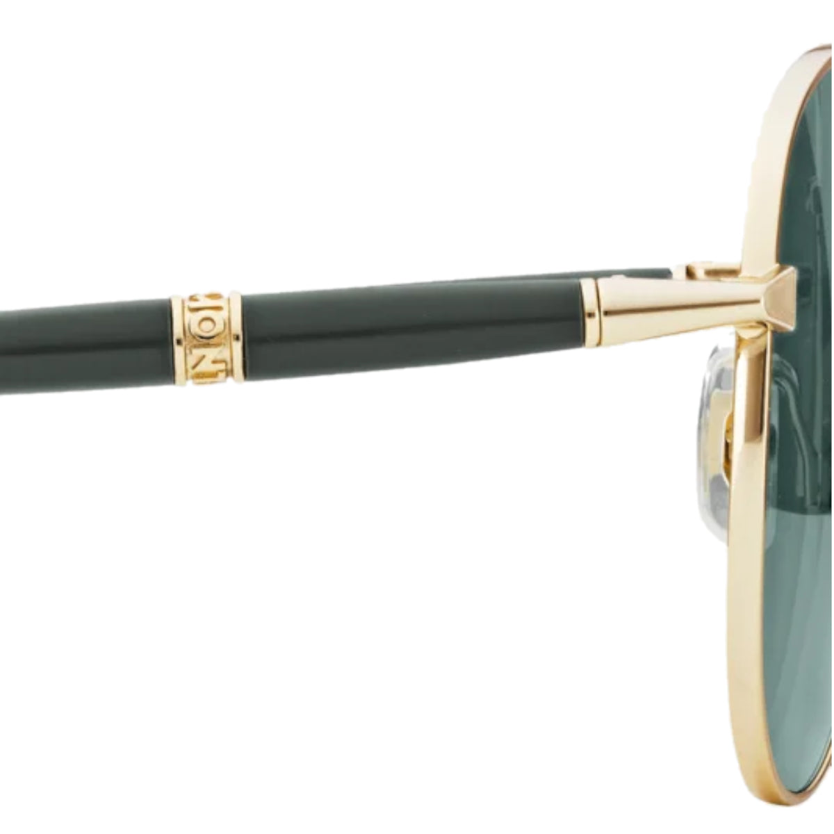 Ces lunettes de soleil carrées possèdent une monture métallique dorée et des verres verts. Elles sont dotées d’un double-pont métallique sur l’avant. Inspirées des instruments d'écriture Meisterstück, les branches tubulaires sont enrichies de trois anneaux fins. Le logo Montblanc est gravé au laser sur le verre gauche et un détail en émail noir est dissimulé sur les extrémités.